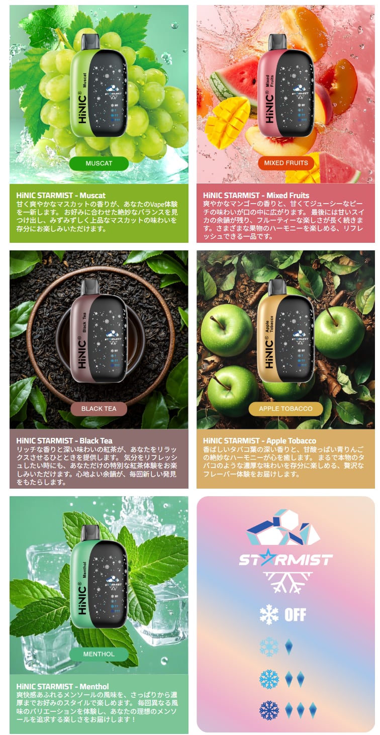 新登場!HiNIC STARMISTはリアルな風味を味わえるだけでなく、満足度の高い喫煙感覚も実現でき、吸い心地を徹底追求した極上の使い捨てVAPEです。