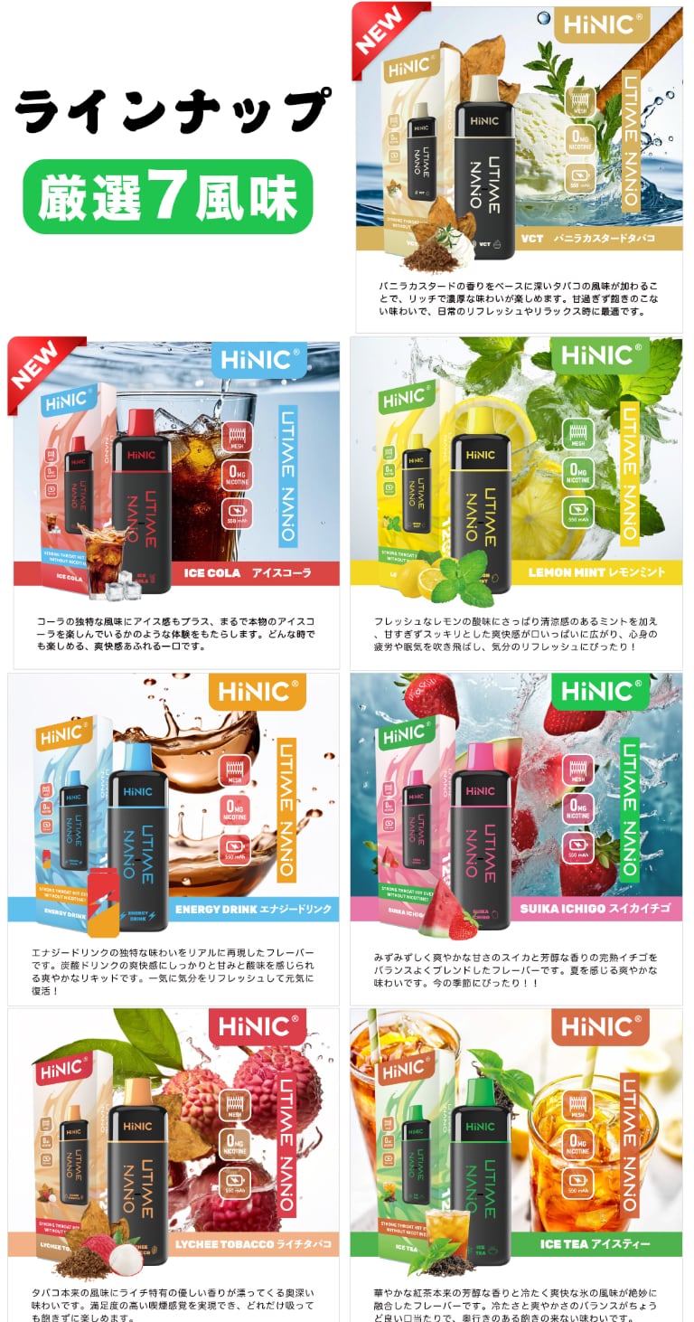 新登場!HiNIC Utime Nanoはリアルな風味を味わえるだけでなく、満足度の高い喫煙感覚も実現でき、吸い心地を徹底追求した極上の使い捨てVAPEです。